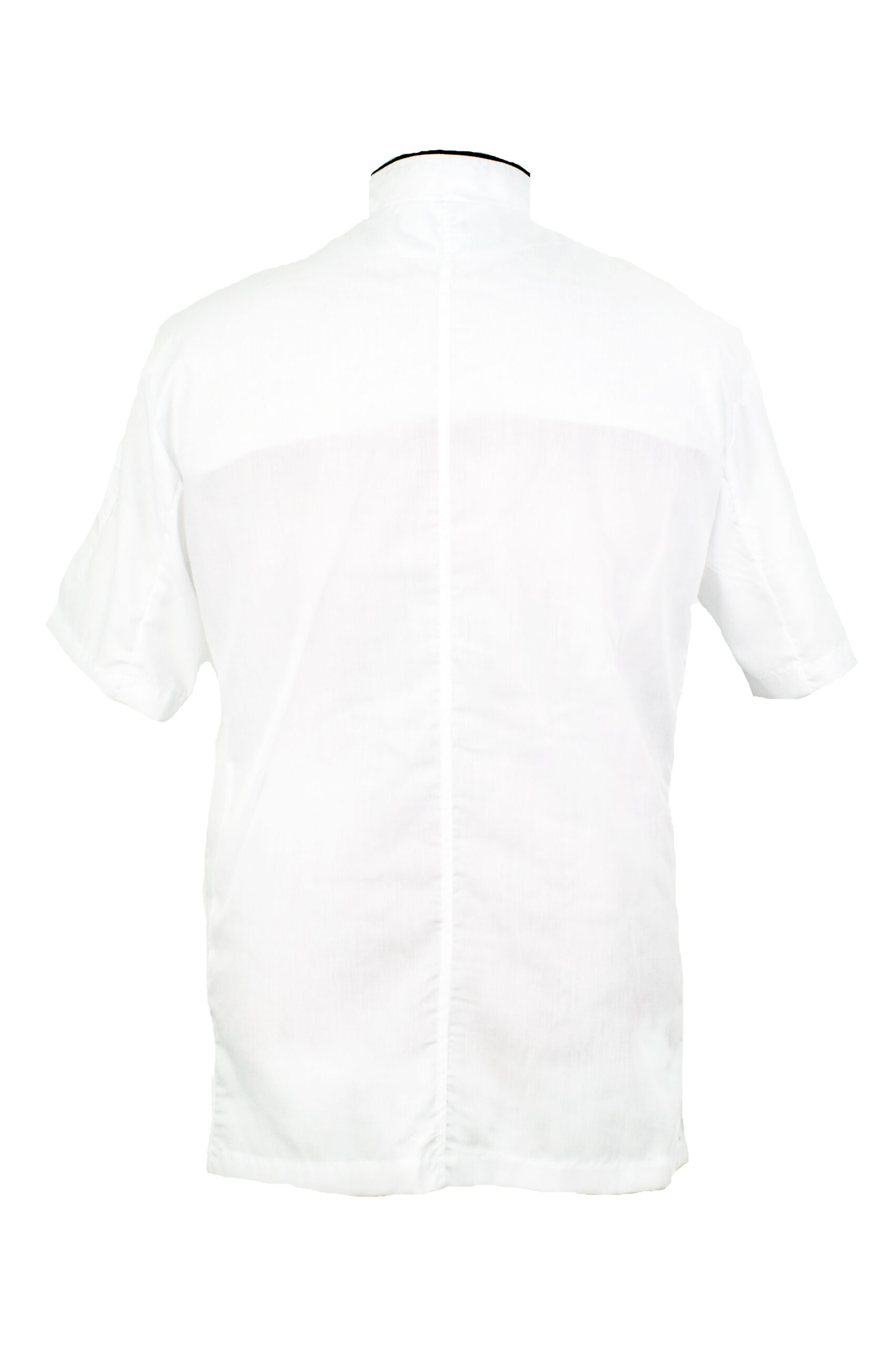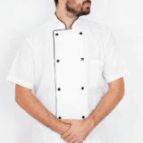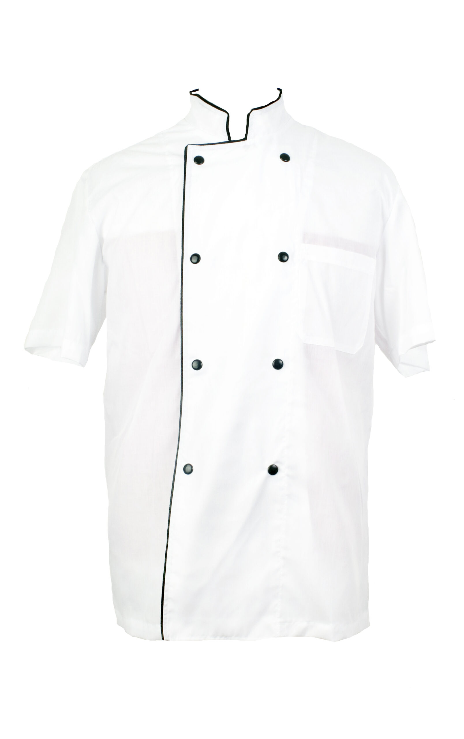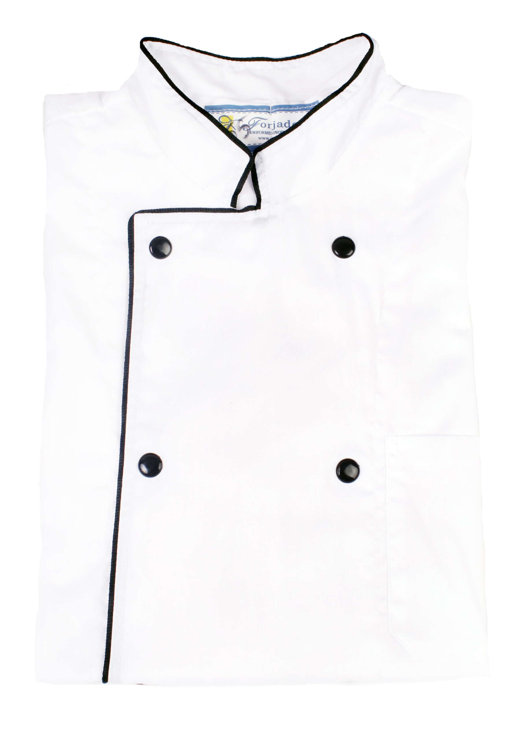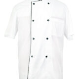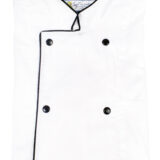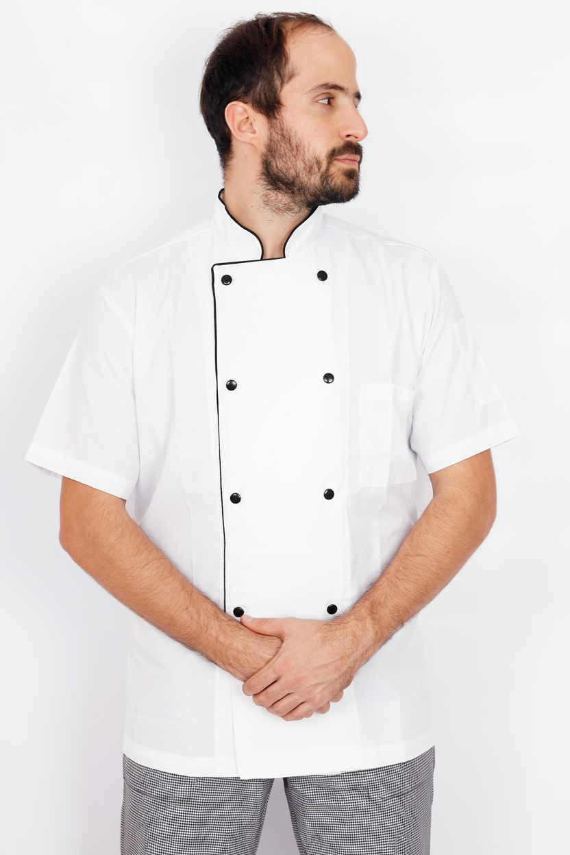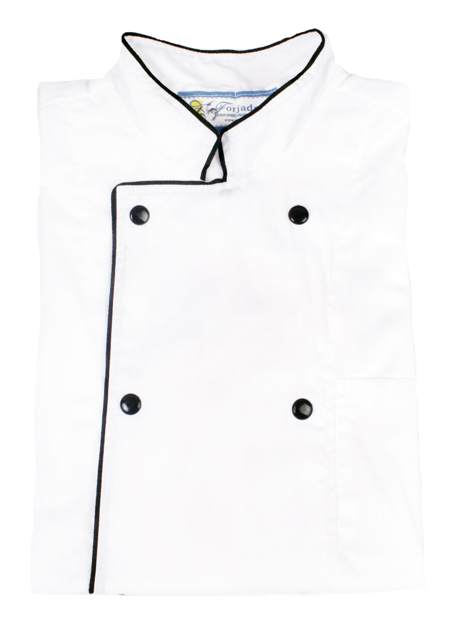 Casaca cocinero cruzada. Combinada con vivo Negro. Manga corta y broches. Tela Batista.