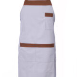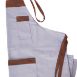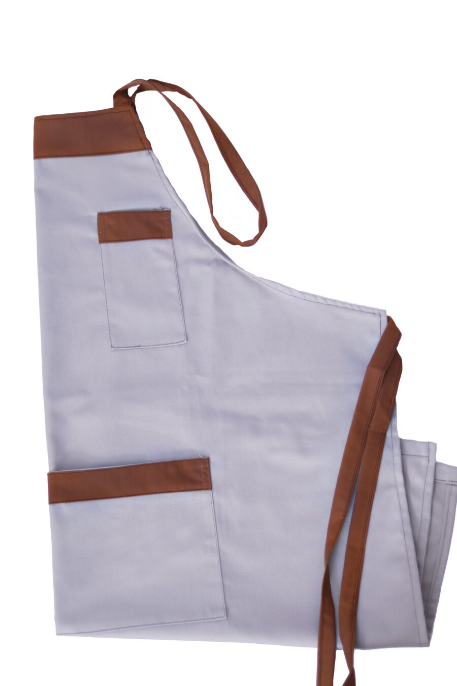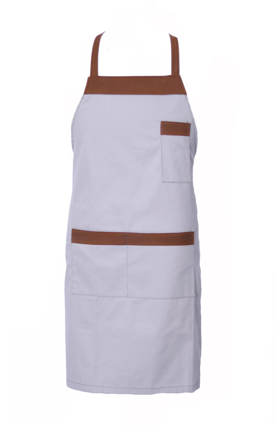 Delantal con Pechera y bolsillo de pecho & canguro. Combinado Marrón y Gris. Tela Gabardina Mezcla.