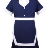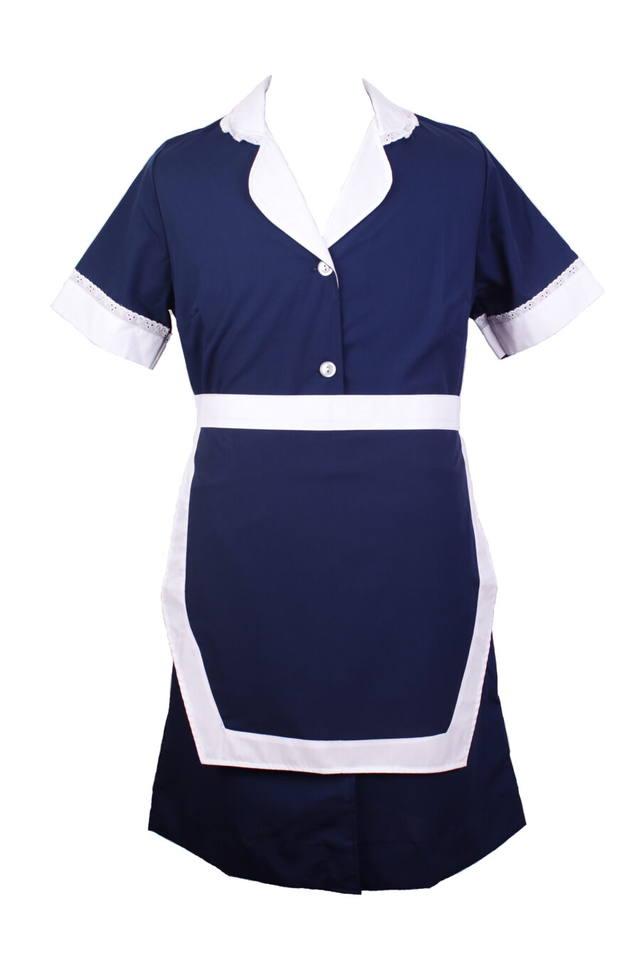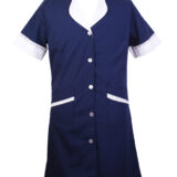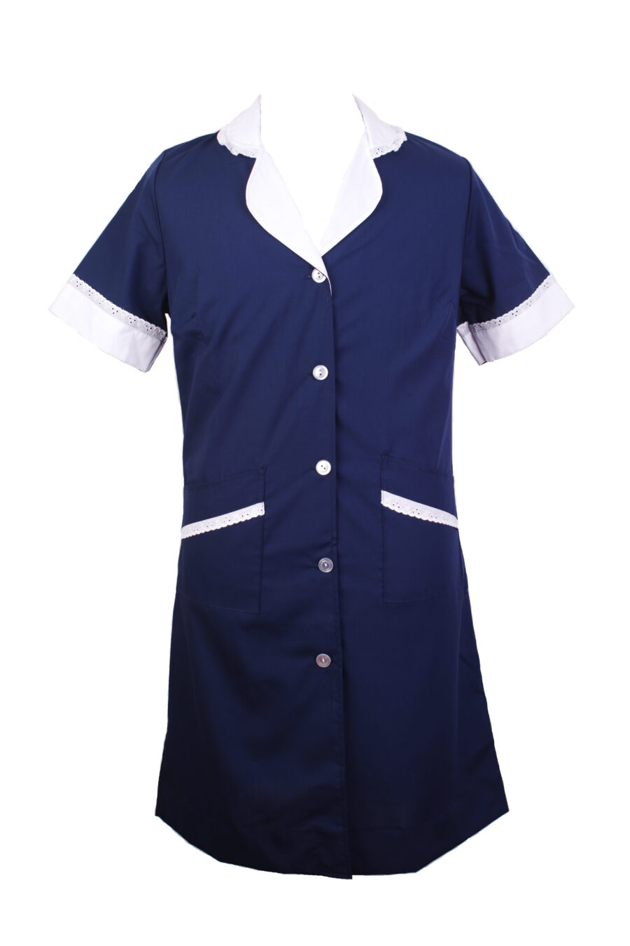 Guardapolvo con delantal de cintura. Cuello, Blolsillos y Vivo Blancos. Detalles en Broderie. Tela Arciel anti-mancha.